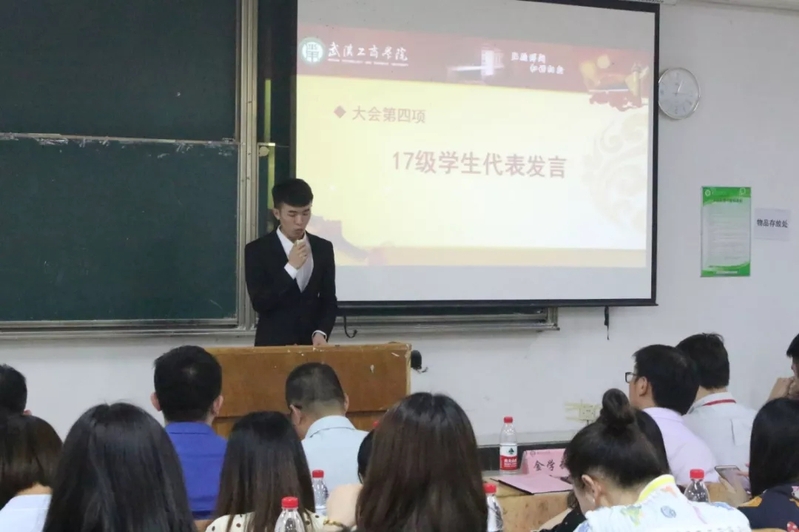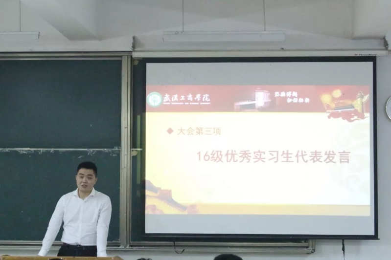 2016级国际贸易专业学生李祺作为优秀实习生代表发言。在上海平安实习的他,工作认真负责,取得了非常好的业绩,同时他用实习工资为家人购买礼物,获得了家人的赞许。