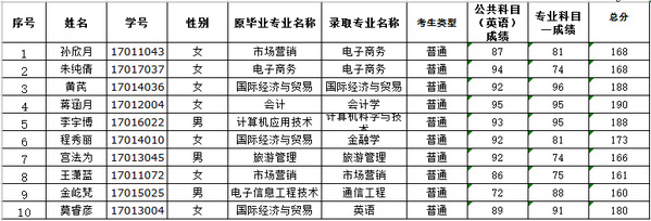 最终通过教务部反馈的数据,此次报考学校专升本考试的考生中,电子商务、国际经济与贸易、会计学、计算机科学与技术、金融学、旅游管理、市场营销、通信工程、英语9个专业第一均被武工商学子包揽。