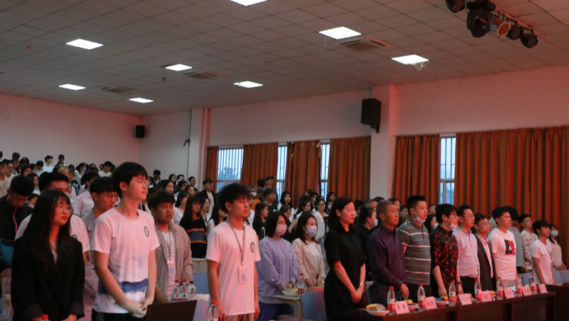 比赛开始之前,全体成员起立面向国旗行注目礼奏唱国歌,现场师生在红旗前在《义勇军进行曲》慷慨激昂的乐曲中庄严肃立,心生澎湃。