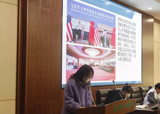 应用技术学院分团委学生会主席欧阳盼盼同学围绕着中美元首举行视频会晤这一热点展开分享,向大家介绍了新时期中美的相处之道,即“相互尊重、和平共处、合作共赢”三点原则,并分享了中美当前着力推动的四个方面的优先事项,分别是展现大国担当,引领国际社会合作应对突出挑战、本着平等互利精神,推进各层级各领域交往,为中美关系注入更多正能量、以建设性方式管控分歧和敏感问题,防止中美关系脱轨失控和加强在重大国际和地区热点问题上的协调与合作。最后还分享了两国领导人在会晤中都强调提出的“中美关系的极端重要性、反对打‘新冷战’”两项原则共识。