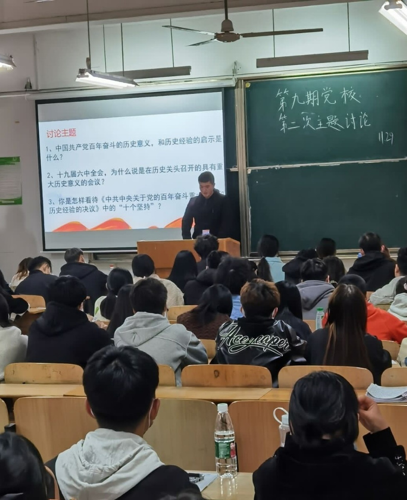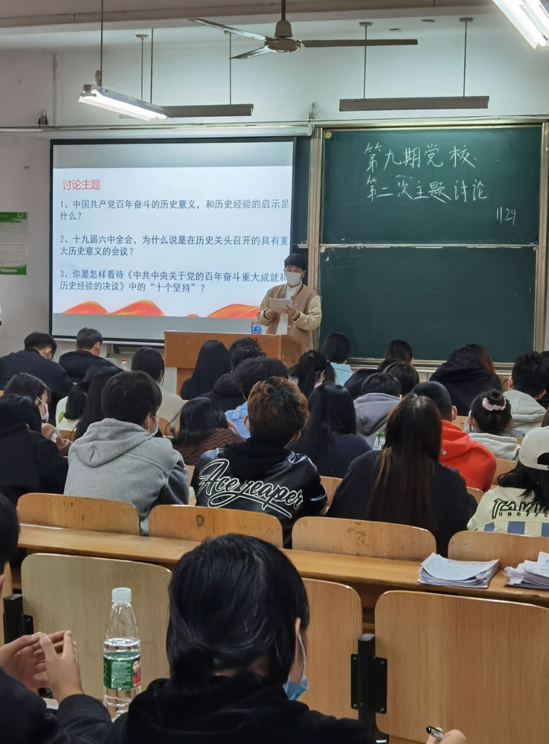 第四次党课是主题讨论。各入党积极分子分别对以下三个主题进行了讨论。一、中国共产党百年奋斗的历史意义和历史经验的启示是什么?二、十九届六中全会,为什么说是在历史关头召开的具有重大历史意义的会议?三、你是怎样看待《中共中央关于党的百年奋斗重大成就和历史经验的决议》中的“十个坚持”?此次讨论由后12小组分享。经过15分钟的激烈讨论,各小组各抒己见,台下同学认真聆听,细致做笔记,掌声雷动。