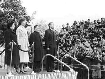 1979年1月29日至2月5日,邓小平应邀对美国进行正式访问。这是新中国成立以来中国领导人第一次访问美国。