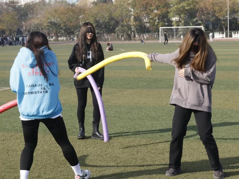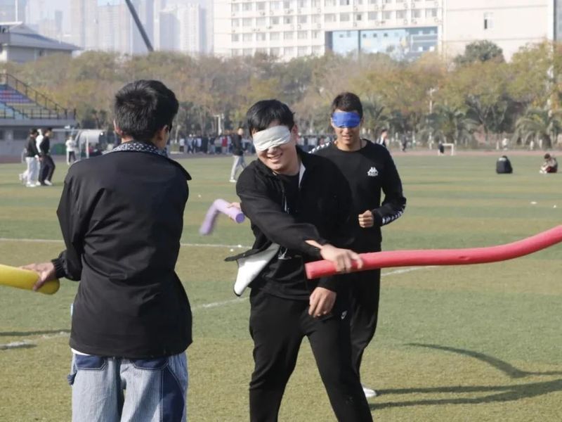 每个组出一个人蒙上眼睛,用提供的软棒,根据队友的指示击打对方,击中得一分,被击中三次则淘汰。队员蒙上眼睛会大大降低他们的感知力,这时充分考验了队友之间的默契,可以按照指示击打到对方。
