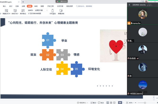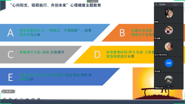 (通讯员:柳娜)在激烈的竞争和社会变革的环境下,当代大学生面临着巨大的压力。因疫情影响,今年原定于5月8日举行的2022年湖北省普通高校专升本考试延期至6月18日举行,这一变化无疑给准备升学的应届毕业生产生不小的影响。为给全体毕业生疏解压力,积极应对社会变革,应用技术学院于2022年4月26日召开了“心向阳光、砥砺前行、共创未来”线上、线下心理健康主题班会。