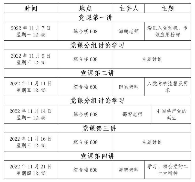 此次党课是为增强同学们对党的认识,进一步提高自身的思想水平和政治素质。坚持党的领导,是党和国家的根本所在、命脉所在,是全国各族人民的利益所系、命运所系,是实现中华民族伟大复兴的根本保证。要始终在思想上、政治上、行动上与党中央保持高度一致。要坚持理论创新,深刻理解中国共产党为什么能,马克思主义为什么行,中国特色社会主义为什么好。我们要以高度的政治自觉深入学习贯彻习近平新时代中国特色社会主义思想,坚持不懈用党的创新理论最新成果武装头脑、指导实践、推动工作。希望参加此次党课的同学要认真学习,领悟课程精华,端正入党动机,积极向党组织靠近。