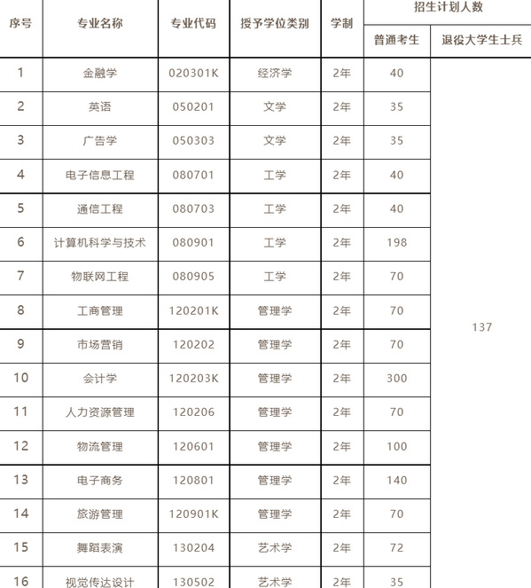 二、招生专业和计划我校专升本招生计划分“普通考生计划”“退役大学生士兵计划”2类。分专业计划如下表: