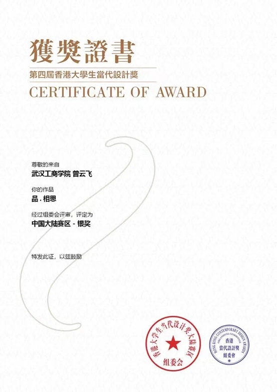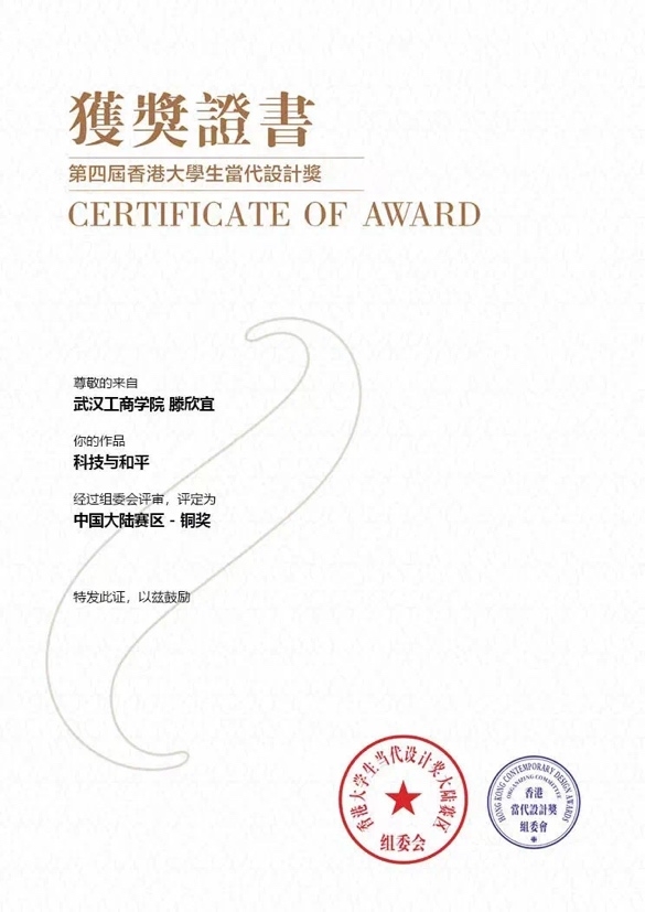 在2022年第四届的香港当代大学生设计奖比赛中,学生们以“城市与发展”或“自由主题”为出发点,充分发挥想象力,将文化底蕴和知识储备有效结合,从社会发展的角度和人文领域思考,通过设计艺术阐释对社会生活的理解和内心的追求,创作出一幅幅优秀的作品。其中,我院涌现出一批优秀学子在比赛中取得了3银1铜的好成绩。例如,卢嘉伟同学以生活为出发点,阐述科技给衣食住行生活和男女老少不同人群带来的生活便捷,荣获银奖;明肯同学以“融于慧,源于心”作为创意定义,表达个人独特的见解荣获银奖;曾云飞同学则创作出一幅充满意境的山水画作品,荣获银奖;滕欣宜同学则以黑白主调阐述“科技与和平”主题,传递对人类未来发展的思考,荣获铜奖。他们的优异成绩再次证明了我院创新实验班和弘博教育在专业指导方面的实力和成就。
