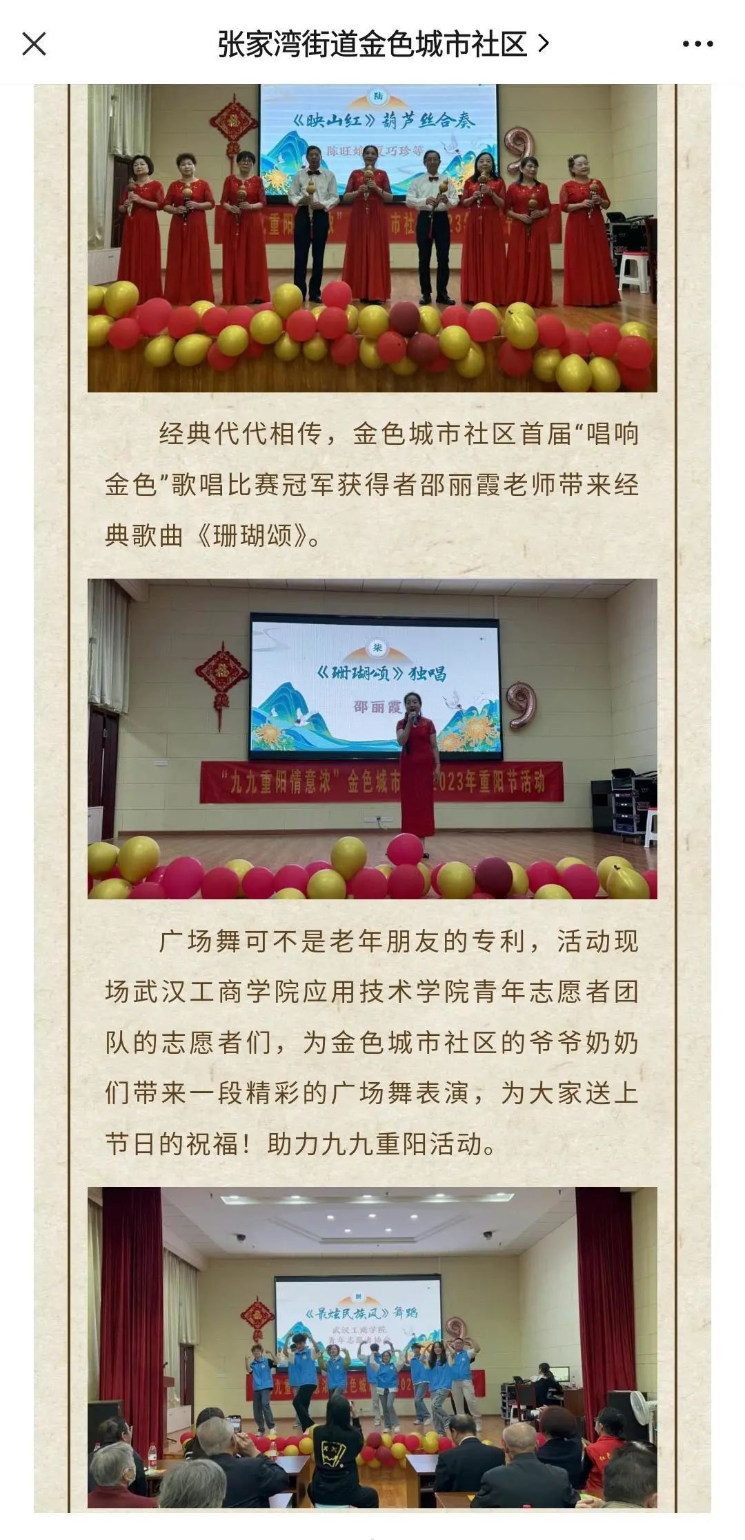 应用技术学院青年志愿者协会在“九九重阳节”到来之际,走进武汉市洪山区张家湾街道金色城市社区开展了爱老敬老志愿服务活动。本次志愿服务活动,以关心、陪伴老人为主,志愿者们通过与老人沟通、一起表演节目既让老人感受到了温暖,又展现了应用技术学院青年志愿者协会的良好精神风貌。