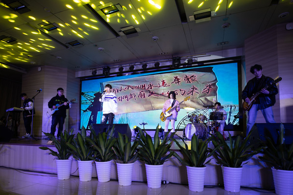 学院表彰大会后,由破碎惑星乐队演奏的《小城夏天》和《我的未来式》两首欢快的开场曲为本次“舞动青春,逐梦星辰”为主题的元旦晚会拉开序幕。