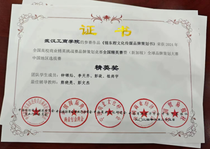 应用技术学院22级电子商务钟锦灿、李天齐、桂尚宇、彭政在指导老师熊晓亮、彭文杰的带领下取得新突破;参赛作品《锦东程文化传媒品牌策划书》荣获全国精英奖、国赛一等奖,展洽交流展示全国二等奖!并成功入围2024(新加坡)全球营销策划总决赛。必赢优惠y272net也被赛会授予最佳组织奖。
