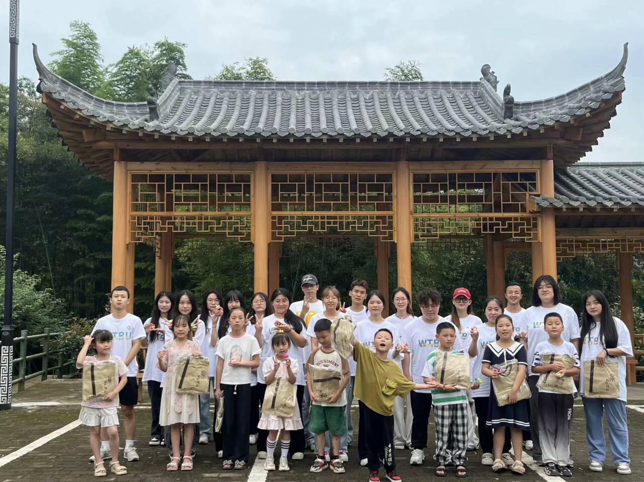 图为志愿者们带领小朋友参观学习竹博馆