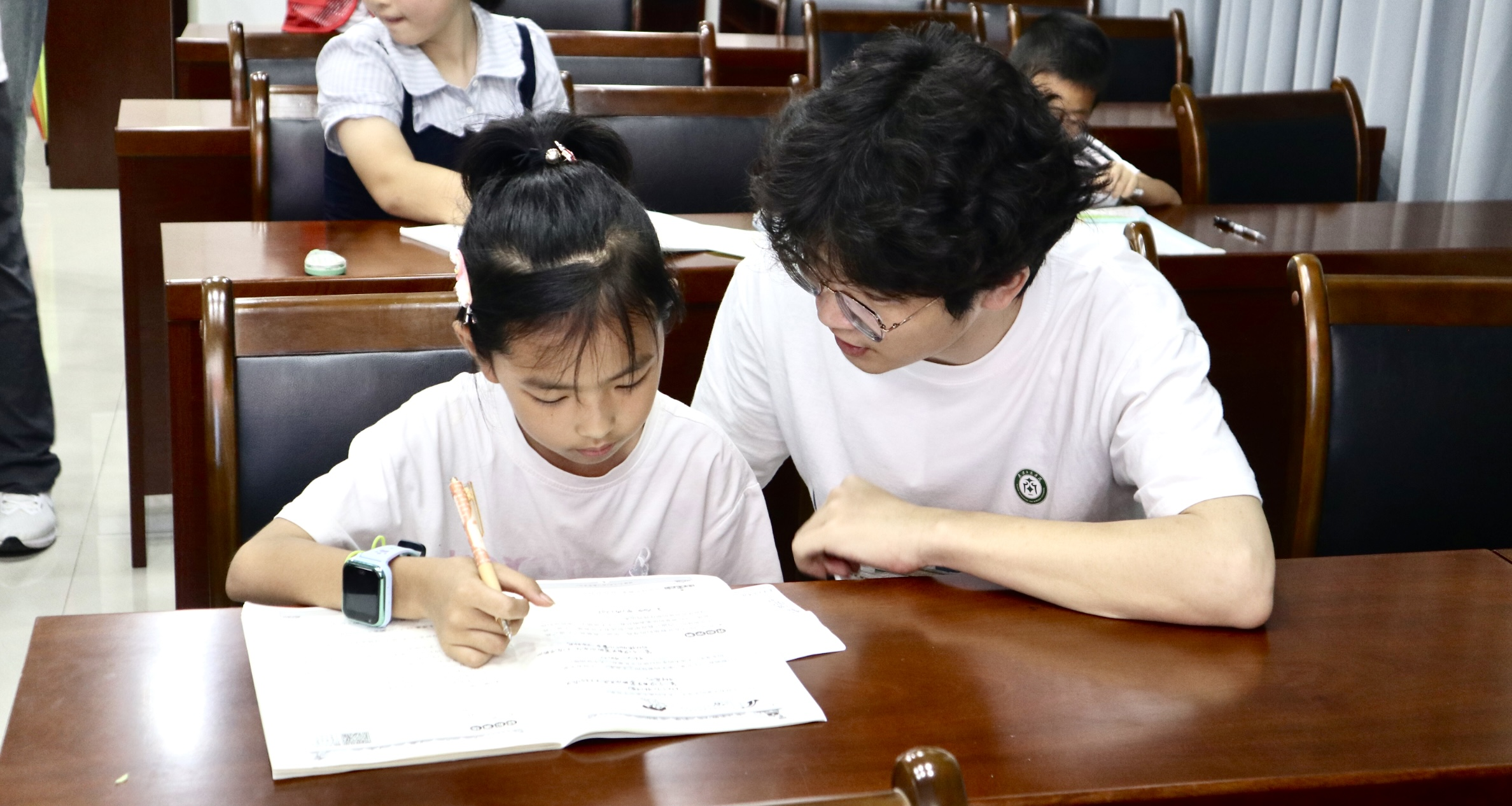 开班首日下午,托管班便热闹起来。小朋友们伏在桌前书写暑假作业,遇到难题时纷纷凑到志愿者老师身边请教,“老师这个字怎么读”“这道题怎么做” 的问询声此起彼伏,氛围既轻松又专注。