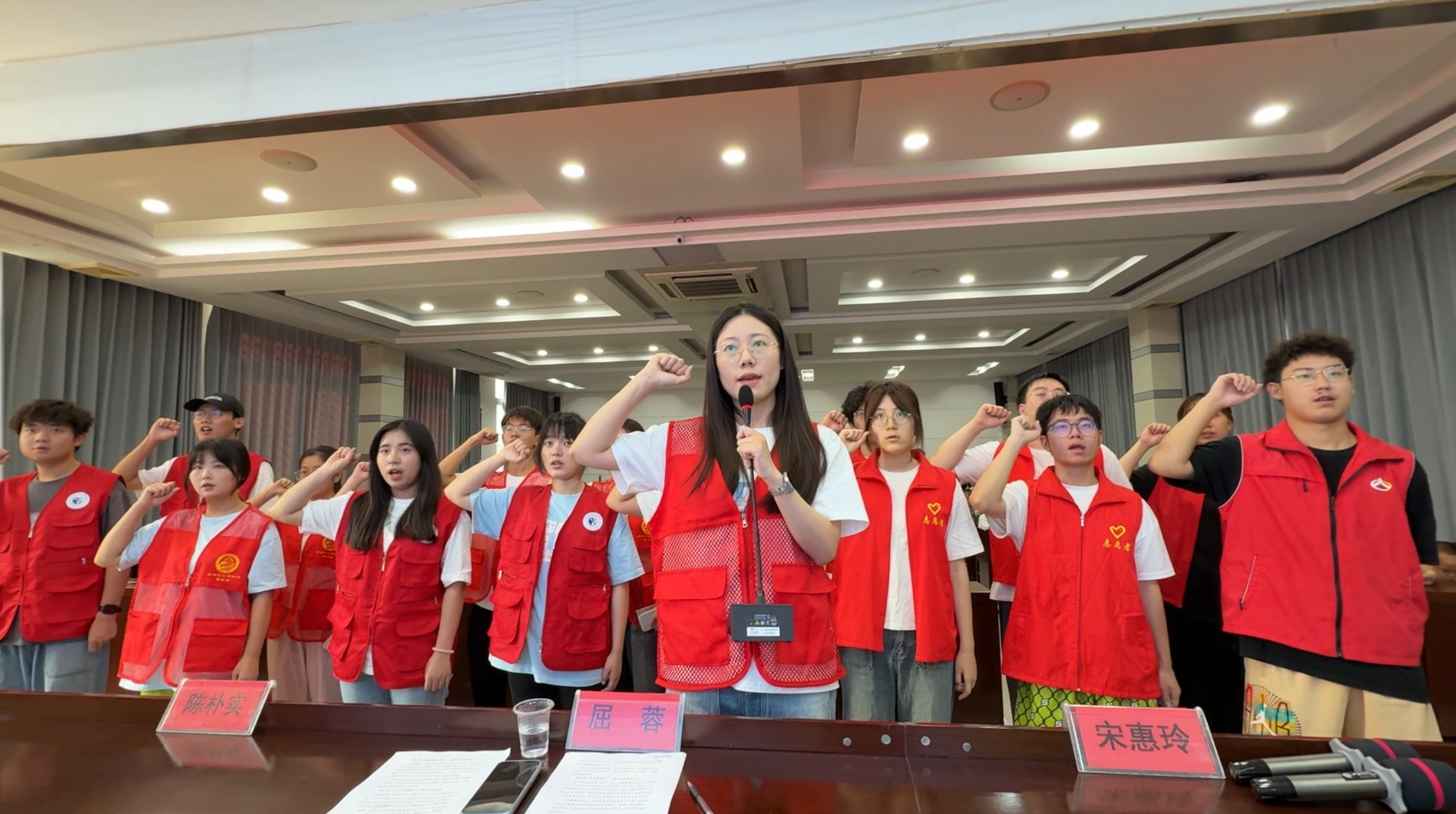 接下来的志愿者集体宣誓环节格外庄重,在带队老师徐清妍的领誓下,大家举起右拳许下承诺,每一句誓言都承载着对孩子们的责任。仪式尾声,社区领导们为孩子们送上学习用品,文具袋里装着的不仅是物资,更是沉甸甸的关爱。