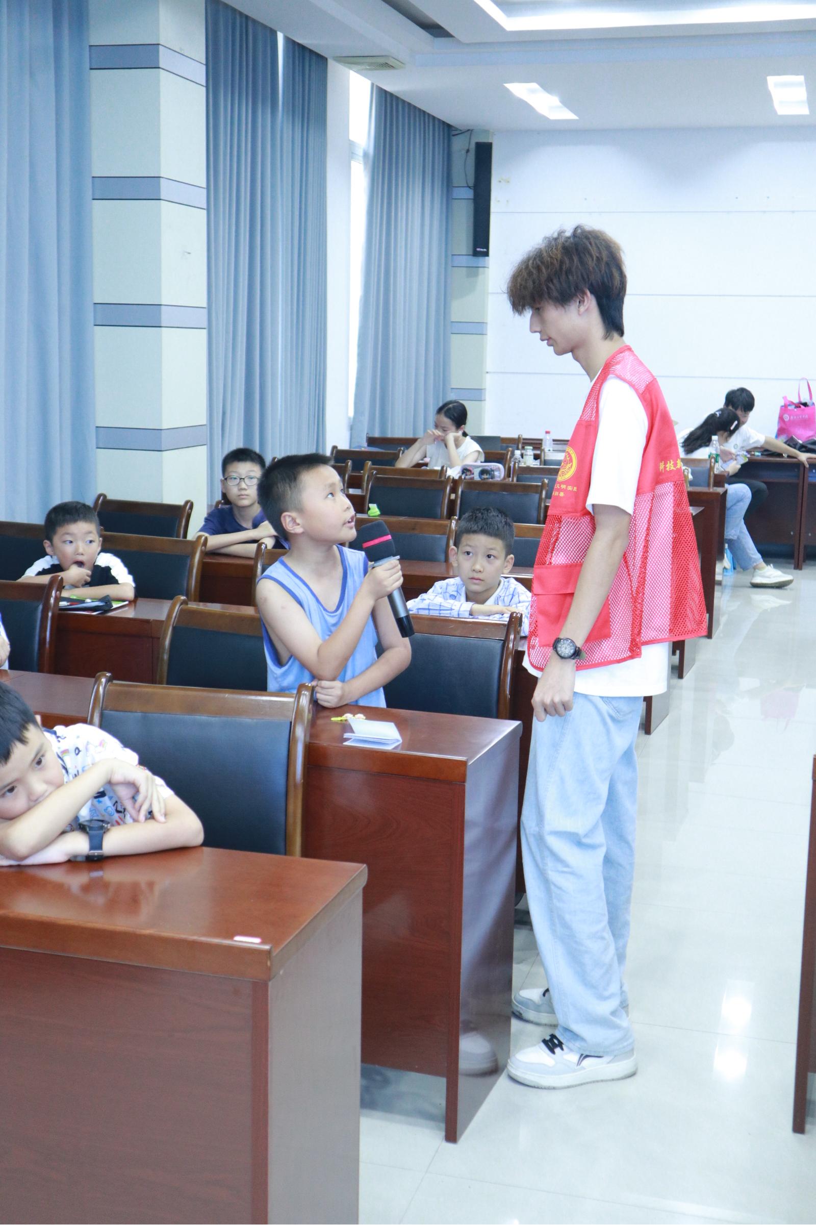 7月9日的课程同样精彩纷呈。上午,由志愿者王力戈组织的读书分享会上,孩子们捧着心爱的书籍勇敢走上台:有的讲述《骆驼祥子》里的故事,有的畅谈《三国演义》中的英雄,还有的分享《小英雄雨来》的勇敢事迹,现场掌声不断。志愿者赵镆涵的音乐课上,他先教给大家唱歌最基本的发音方式,随后带着小朋友们学唱《听妈妈的话》,稚嫩的歌声里满是温情。