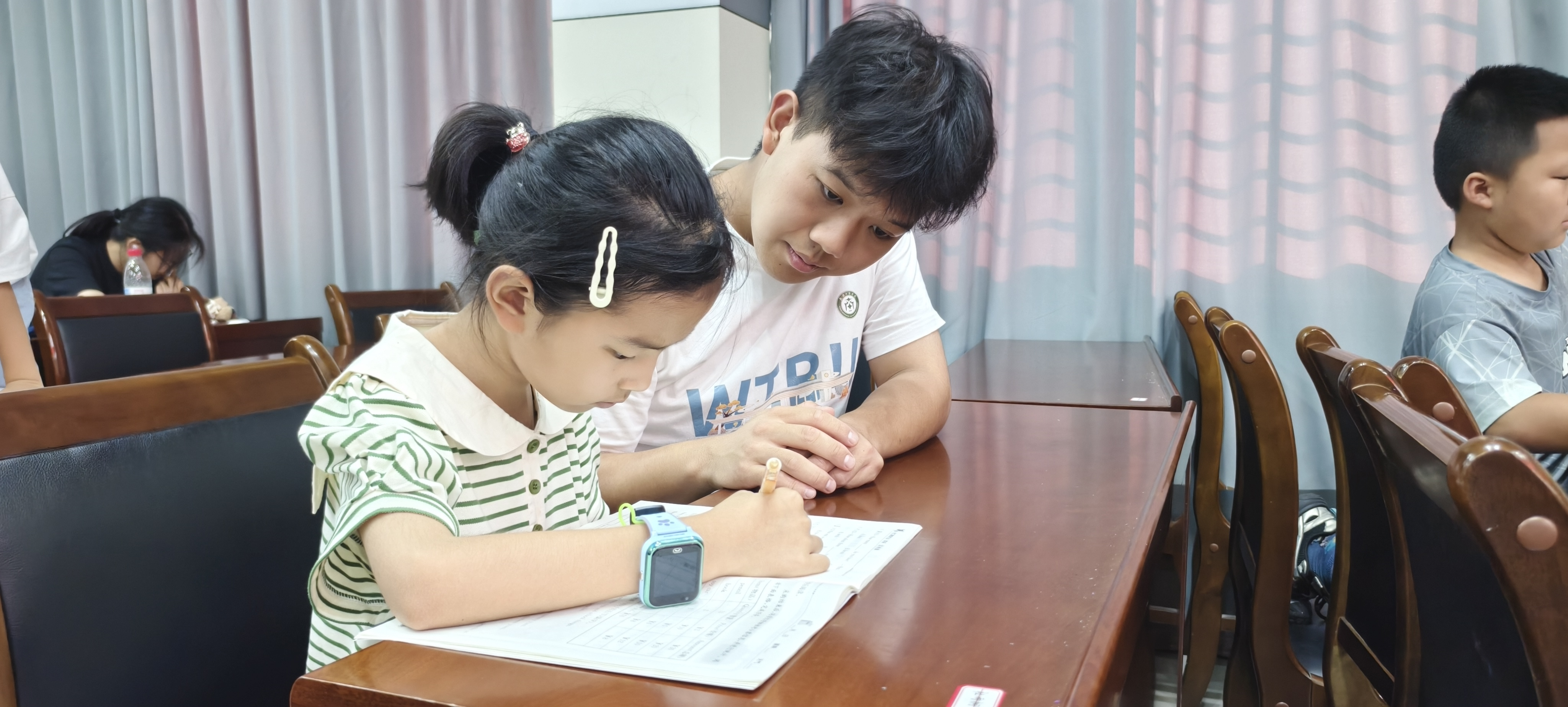 开班首日下午,托管班便热闹起来。小朋友们伏在桌前书写暑假作业,遇到难题时纷纷凑到志愿者老师身边请教,“老师这个字怎么读”“这道题怎么做” 的问询声此起彼伏,氛围既轻松又专注。
