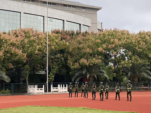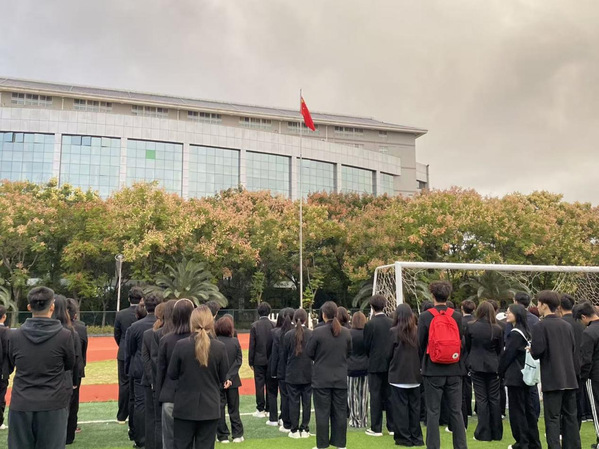 伴随着激昂的音乐,护旗手迈着铿锵有力的步伐护送国旗入场,鲜艳的五星红旗在全体师生的注目下缓缓升起、迎风飘扬。在场师生肃立行注目礼,齐唱国歌,歌声里满是对祖国的赤诚与对新学期的期许。