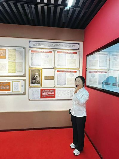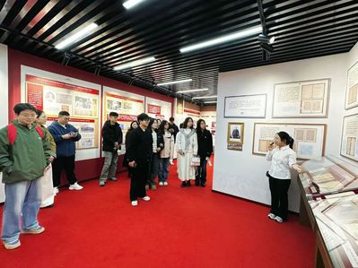 展览现场,师生党员们跟随讲解员有序参观,认真端详泛黄的早期译本、手稿复刻件等展品,不时围绕文献背后的红色故事交流探讨。